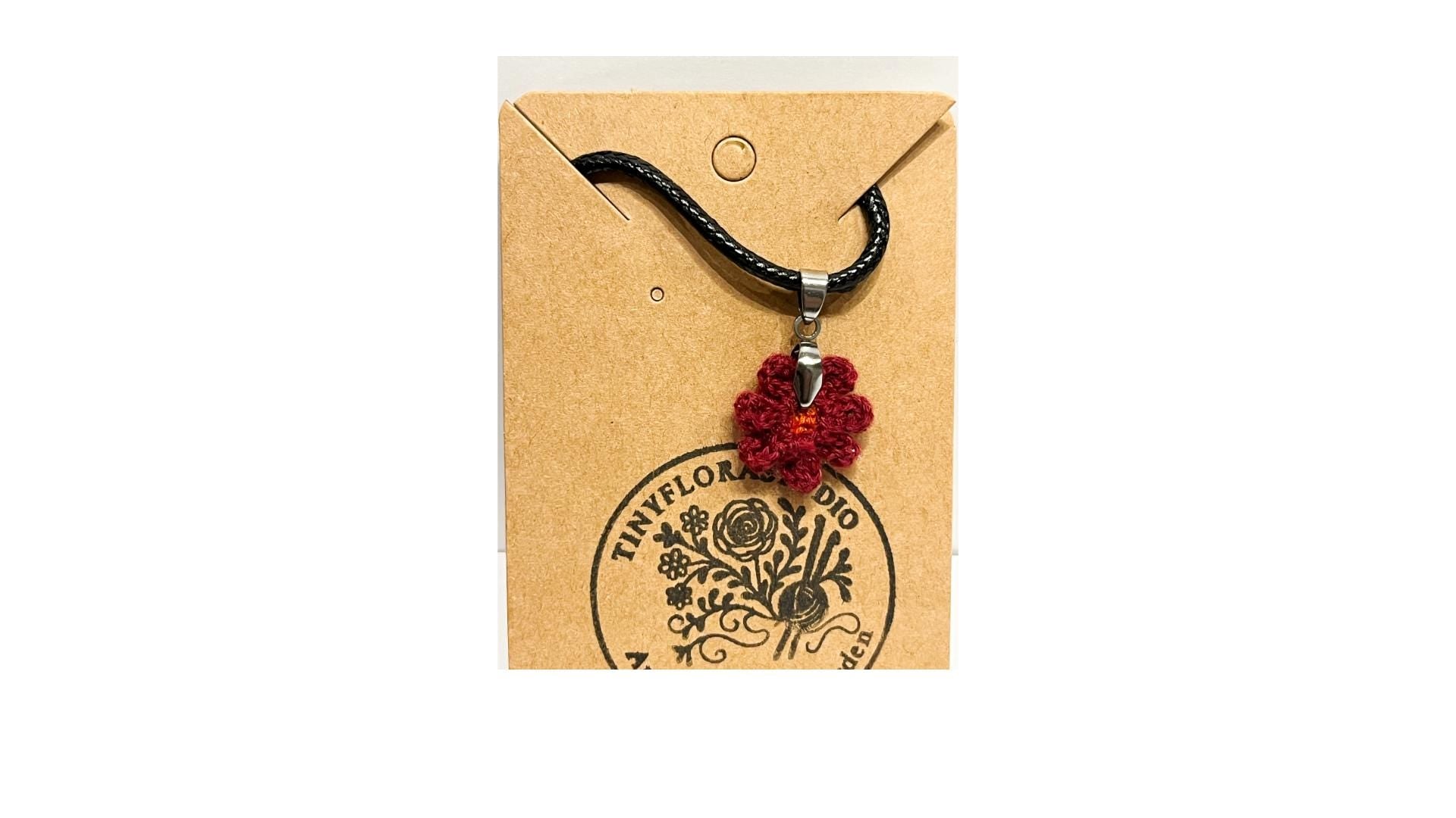 This Micro Crochet Zinnia Necklace features a tiny deep-red flower with a fiery orange center, delicately hand-crocheted with fine cotton thread. The pendant hangs from a sleek black cord with a silver-tone clasp, blending elegance and warmth in a minimalist design. A perfect everyday accessory for nature lovers or a charming handmade gift.
